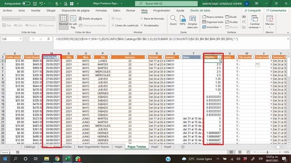 Lo que hace es que si en la columna y tengo gestión me ponga 1 o me pone un guion medio si no se gestiono y en la columna z lo contrario, después lo que hace es que en la columna n donde tengo la fecha de recuperación busca la fecha en un catalogo donde tengo las fechas y el objetivo que es 5 por día, en la columna aa es la suma de y y z que debe de dar 1 y lo que hace es que en la columna i toma el primer valor y lo busca y saca un promedio del periodo en que se realizo el cobro y en la columna m toma el nombre del asesor y lo busca de igual manena