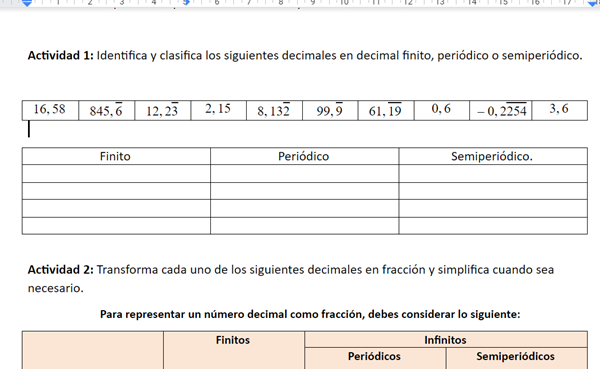 Actividad 1: Identifica y clasifica los siguientes decimales en decimal finito, periódico o semiperiódico.