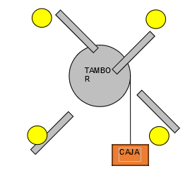 Una polea complicada consiste en cuatro esferas idénticas colocadas en los extremos de rayos que se prolongan desde un tambor giratorio (Ver figura). Una caja está unida a una cuerda delgada y ligera que se enrolla en el borde del tambor. Cuando se libera del reposo, la caja adquiere una rapidez V después de caer una distancia d. Ahora las cuatro esferas se mueven hacia adentro más cerca del tambor, y de nuevo la caja se suelta del reposo. Después de caer una distancia d, ¿su rapidez será igual a V, mayor que V, o menor que V? Demuestre por qué.