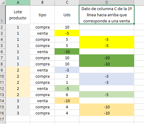 Intento crear una macro para calcular la columna D, es decir que me ponga en la línea que corresponde a una compra, el dato de la columna C inmediatamente anterior que corresponde a una venta . Hasta ahora esto siempre lo hago así para hacer referencia a celdas anteriores: