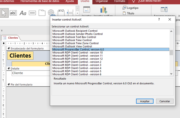 Quiero insertar un control ActiveX en un formulario de una BDD Access (una barra de progreso), pero en el menú de insertar controles, este tipo de controles está desactivado (el título ActiveX aparece atenuado).