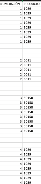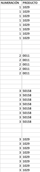 Me gustaría hacer la siguiente numeración, en la cual por cada PRODUCTO se le asigne un número en la primera columna denominada "Numeración" (al repetirse el producto 1029, me lo vuelve a numerar como "3", cuando debería ser el "4"). Es decir, la tabla me gustaría que quedase del siguiente modo: