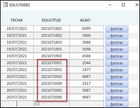 Espero que haya entendido de dar de alta uno con el mismo número, para mi es renumerar las solicitudes de la fecha. Tengo este ejemplo con 1 tabla 1 formulario y 1 módulo
