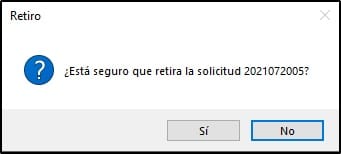 Ahora voy a retirar la solicitud número 2021072005 haciendo clic sobre el botón Retirar me preguntará con el siguiente mensaje.