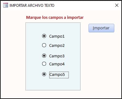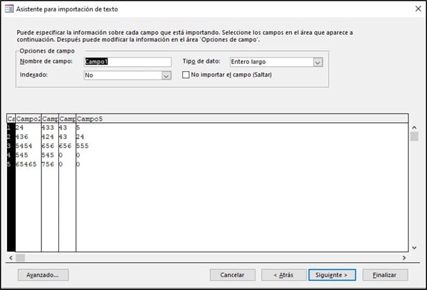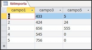 Voy a importar solo los campos, campo1, campo3 y campo5, hago clic en Importar y obtengo.