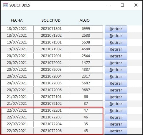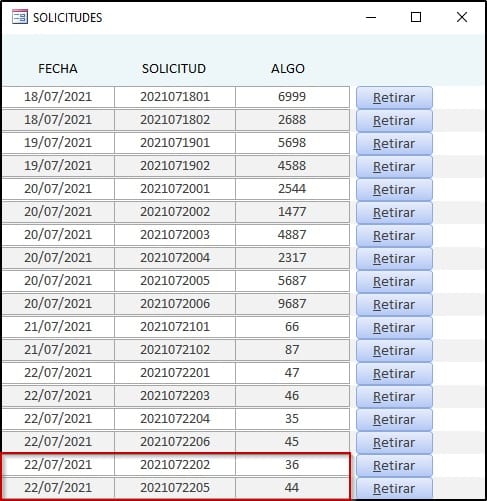 Voy a retirar los registros que aparecen marcados en rojo, es decir las solicitudes 2021072202 y 2021072205 y obtengo: