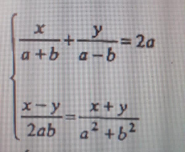 Para la primera te recomiendo usar la segunda expresión. Pasa los denominadores al otro lado y simplificando te quedaría x(a-b)^2=y(a+b)^2. Despeja digamos x de esta y la sustituyes en la primera. Luego de simplificar un poco, sacando factor común etc. Te dará y=(a-b)^2 , x= (a+b)^2