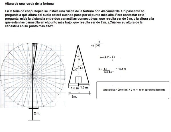En la feria de chapultepec se instala una rueda de la fortuna con 40 canastilla. Un paseante se pregunta a qué altura del suelo estará cuando pasa por el punto más alto. Para contestar esta pregunta, mide la distancia entre dos canastillas consecutivas, que resulta ser de 3 m, y la altura a la que están las cabinas en el punto más bajo, que resulta ser de 2 m. ¿Cuál es su altura de la canastilla en su punto más alto?