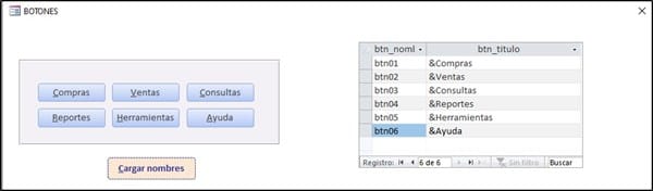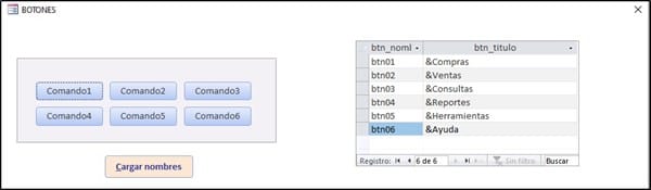 Al abrir el formulario aparecen los 6 botones con el nombre que asigna Access por defecto, cada botón tiene el nombre btn01, btn02, ... hasta btn06, son los mismos que están en la tabla columna btn_nombre. Al hacer clic en el botón Cargar nombres, obtengo: