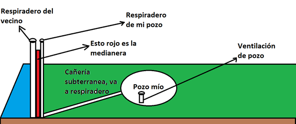 Mi duda es entonces, existe la posibilidad de que esa agua que se ve debajo de mi caño subterráneo, ¿sea una filtración del pozo del vecino y que por eso esté yendo agua hacia mi pozo de forma continua y nunca baje el nivel del pozo? Puedo remover este caño subterráneo por las dudas que va a ese respiradero, ¿o si o si es necesario? Aclaro que la tapa del pozo ya tiene un cañito respirador y que mi pozo está a una distancia de unos 3 metros de esta respiradero de la medianera. Adjunto un dibujo para que quede más claro. Les solicito sus consejos para poder solucionarlo. Muchas gracias