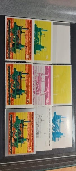 Tengo esta muestra de imprenta de la serie I Centenario de los ferrocarriles japoneses, 1ª Locomotora española. 1848. Aéreo, de Guinea Ecuatorial, sé que tienen un valor, pero no sé cómo se calcula, los valores que he encontrado como sello usado en buen estado y nuevo con varios valores. ¿Sabeis cómo se puede valorar?