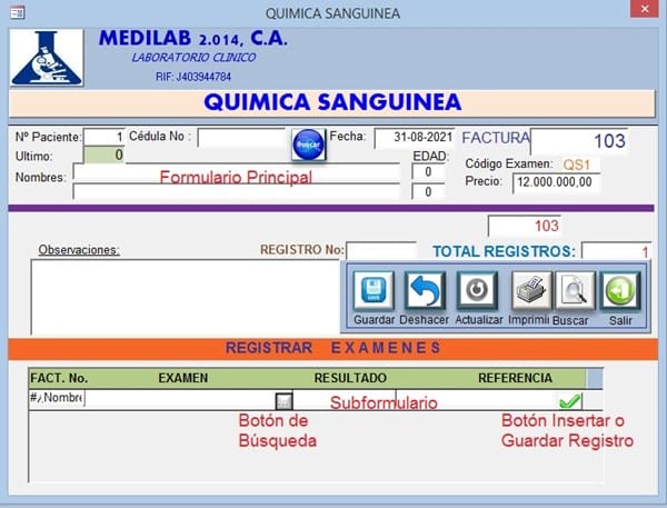 Supongamos que la tabla temporal para el subformulrio se llame TemFac, debe tener los campos: NumFac, Examen, Resultado, Referencia.