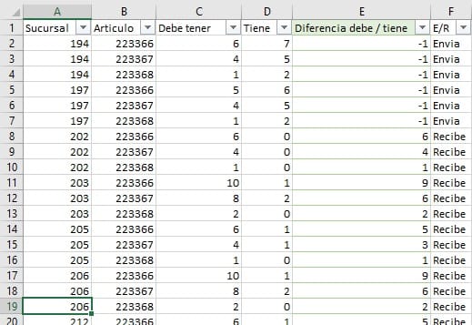 Ejemplo a la sucursal 194 le sobra 1 unidas del articulo 223366, y a la sucursal 202 le faltan 6 unidades del mismo articulo (si, me quedaron los signos al revés =0)