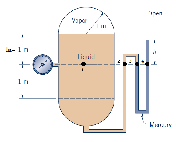 El tanque cilíndrico con extremos hemisféricos que se muestra en la fig. Contiene un líquido volátil y su vapor. La densidad del líquido es de 800kg/m3 y su densidad de vapor es insignificante. La presión en el vapor es de 120 kPa (abs) y la presión atmosférica es de 101 kPa (abs). Determine: (a) la lectura de presión manométrica en el manómetro, y (b) la altura, h, del manómetro de mercurio.