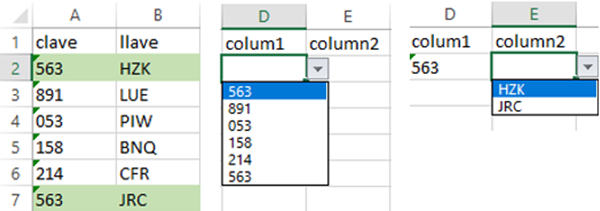 Por ejemplo si yo selecciono la clave 563 en column1 que en column2 solo me permita poner las llaves HZK Y JRC porque existe esa combinacion en la primer pestaña.