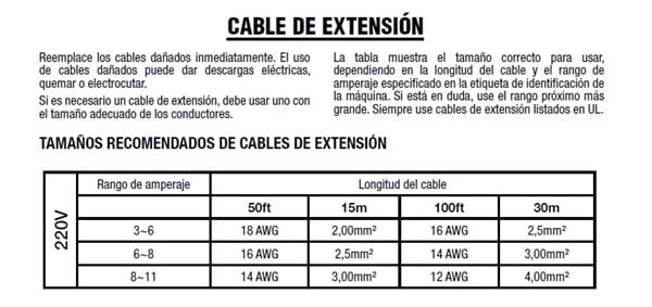 Y en el manual del fabricante me habla de cable de extensión pero habla de un rango de 8 a 11amperios. Aquí abajo les dejo la foto de lo que dice el manual