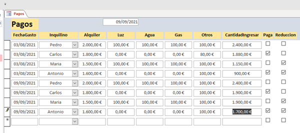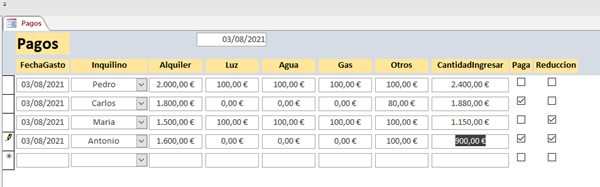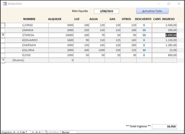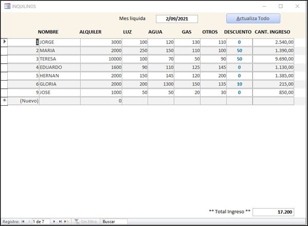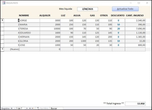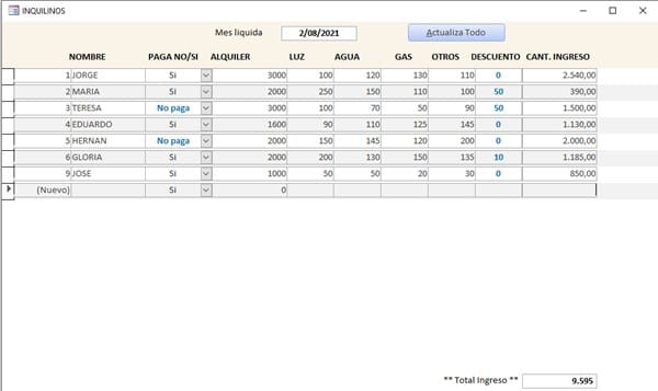 Agradecer antes que nada vuestra sabiduría y ayuda. Estoy haciendo una base de datos para controlar inmuebles en alquiler. En ocasiones, los suministros (luz, gas, agua, etc) los paga el propietario y los inquilinos los pagan después, al pagar el alquiler. En otras ocasiones, el precio del alquiler, durante los meses de julio y agosto, se reduce a la mitad por acuerdo entre las partes. Dicho esto, necesito una fórmula que me calcule la cantidad que tengo que ingresarle al propietario en función de estos campos: