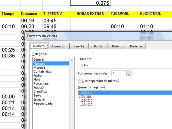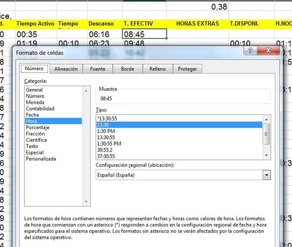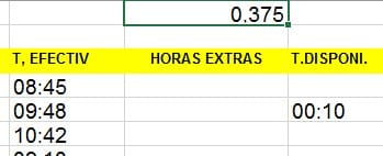 Hola, te envío muestra de los formatos cómo están en este momento. La columna "T.EFECTIV" lleva formato de "hora". Y donde ves la celda con 0.375, probé con el formato de hora y luego con número.