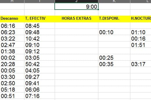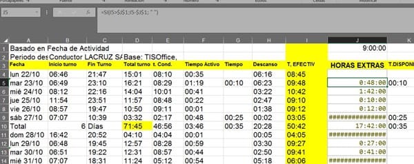 Otro problema que tengo es que si te fijas en las columnas anteriores: inicio tturno y fin turno : son las horas que indican el inicio y finalización de la jornada. Las otras columnas: t.conducción, tiempo activo, son tiempos computados y registrados. Al ser datos volcados de otra aplicación, el formato es tal y como ves, p. ej: T. conducción: 08:10. La consulta es ¿cómo puedo indicar que el 08 son horas totales y 10 son minutos. En este caso la conducción total del día es 08:10 horas. Para cuando pase el ratón y seleccione varias celdas las vaya sumando.