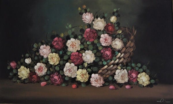 Tengo un oleo de canasta con rosas, tiene una firma que me gustaría saber de quien es. Por la parte trasera, el marco tiene la siguiente información escrita a lápiz: 631, Venecia, OH, 60.3 X 111.3