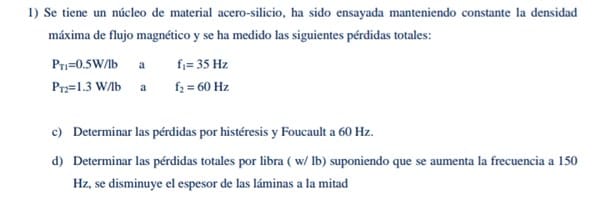 -Determinar las perdidas totales por libra w/lb suponiendo que se aumenta la frecuencia a 150 Hz, se disminuye el espesor de las laminas a la mitad