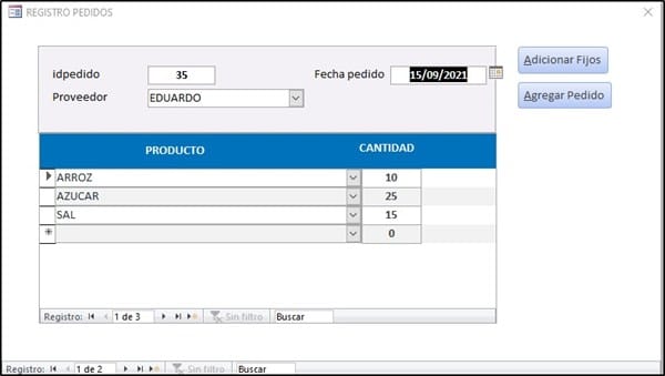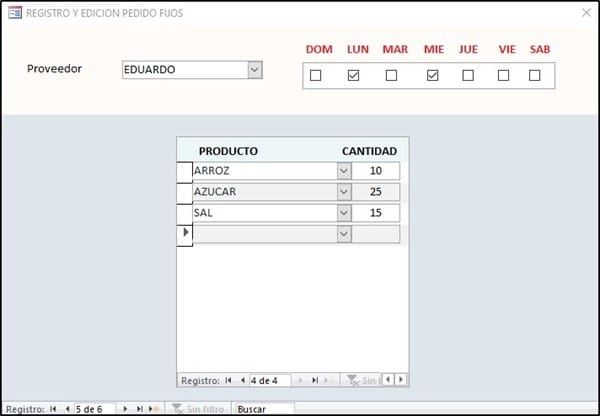 Estoy realizando una base de datos en la que recojo los pedidos de los clientes y con esto generó la propuesta de pedido que mando a mi proveedor, la cosa es que aparte de lo que los clientes me piden tengo un pedido fijo, los pedidos los mando los viernes y los martes de todas las semanas, habría posibilidad que access me generará el pedido fijo todos los viernes y los martes a parte de lo que se ha pedido fuera del fijo