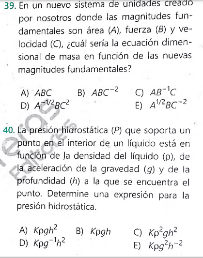 $$\begin{align}&\text{Las magnitudes que nos dan son:}\\&A)[Area]:m^2\\&B)[Fuerza]:N=Kg \cdot m/s^2\\&C)[Velocidad]=m/s\\&\text{Nos piden la ecuación dimensional de masa, para eso tratamos de ver}\\&\text{Mezclando las ecuaciones (solo con el análisis dimensional), como podemos }\\&\text{despejar la masa. Sabemos que Fuerza va a estar seguro, porque es la única que}\\&\text{tiene la masa, y como está en el numerador, seguro estará en el numerador}\\&B : Kg \cdot \frac{m}{s^2}\\&\text{Pero si ponemos la fuerza, nos están sobrando distancias y tiempo}\\&\text{Si dividimos por la raíz cuadrada del área, tenemos}\\&B A^{-1/2}=Kg \cdot \frac{m}{s^2} \cdot \frac{1}{\sqrt{m^2}} =\frac{Kg}{s^2}\\&\text{Estamos cerca, pero sobran segundos al cuadrado, si dividimos entre velocidad al cuadrado tenemos}\\&B A^{-1/2} C^{-2} = \frac{Kg}{s^2} \cdot \frac{s^2}{m^2}=\frac{Kg}{m^2}\\&\text{Nos vuelve a sobrar Area en el denominador, así que multiplicamos por ella}\\&B A^{-1/2} C^{-2}A = \frac{Kg}{m^2} \cdot m^2=Kg\\&\text{Llegamos a lo que queríamos, ahora solo debemos acomodar la expresión y vemos que}\\&B A^{-1/2} C^{-2}A = BA^{1/2}C^{-2}\\&\text{Están en otro orden, pero es tu respuesta E, que es equivalente}\end{align}$$Ahí te lo resolví intentando mostrarte 'paso a paso' el razonamiento, otra opción es probar todas las combinaciones posibles que te dan a ver en que unidad queda, por ejemplo la opción A)