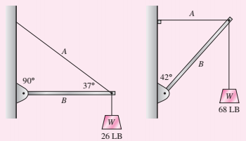 Calcule la tensión en la cuerda A y la fuerza de empuje de las barras marcadas como B en las estructuras siguientes que se muestran en la figura de abajo.