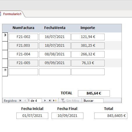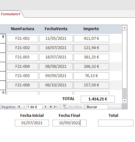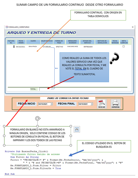 Dos formularios. 1 es formulario continuo que esta amarrado a la tabla DOMICILIOS. 2 el segundo formulario esta en blanco, solo contiene los 2 botones de consulta e impresión, con su respectivo código y los 2 tex box de fecha inicio y fecha final. MI PREGUNTA, al momento de realizar la consulta por fecha, como realizo la sumatoria del campo VALORSERVICIO de la tabla DOMICILIOS, y que dicho resultado lo deje en el tex box de TOTAL del formulario continuo.