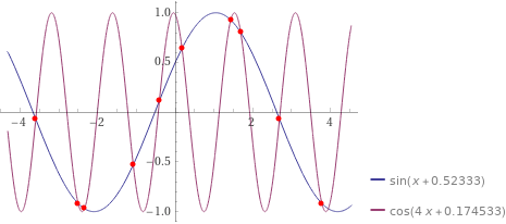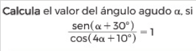 Con estos datos podes dibujar las dos curvas superpuestas, y estimar las intersecciones para el dominio comprendido alrededor de alfa = 0, de modo de que sean ángulos agudos.