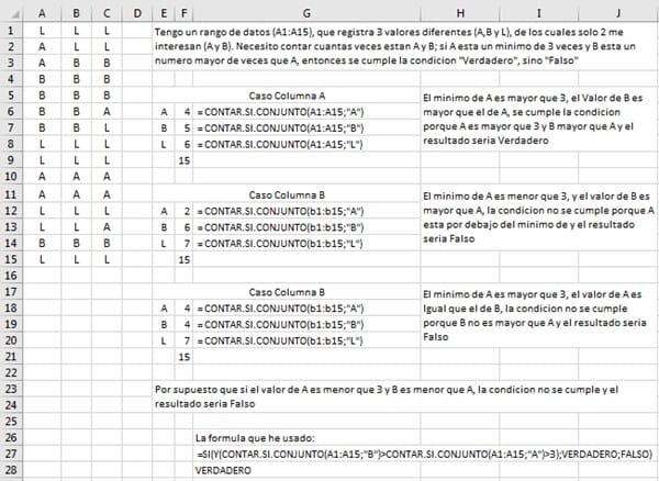 1- Verdadero si en el rango A1:A15, hay un mínimo de 3 de "A"; y la cuenta de las "B" es superior a ese mínimo de 3; falso si no se cumple la condición