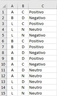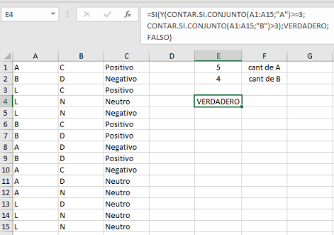 3 - Verdadero si en el rango C1:C15, hay un mínimo de 3 de "Positivo"; y la cuenta de las "Negativo" es superior a ese mínimo de 3; falso si no se cumple la condición