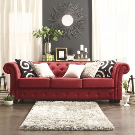 Esto sería en líneas muy generales aunque como te indico, estaría muy bien conocer tus gustos y estilo y ver el espacio en cuestión. Te adjunto una foto de un sofá muy elegante y clásico en vino tinto con adornos en plata, para que veas un poco como queda por ejemplo este contraste. Y otra foto para que veas el efecto de cojines con estampado geométrico, alfombra en color blanco roto, plantas y adornos en plata...