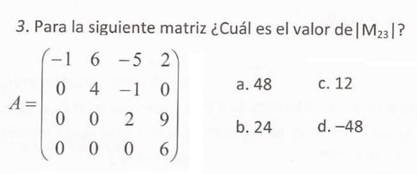 El valor del determinante de A, es -48, dado que se redujo a matriz triangular inferior, se multiplican los elementos de la diagonal principal. Pero el ejercicio pide la determinante (M_23), ordenando y ejecutando ese determinante me resulta cero, pero desconozco cuál propiedad se aplica en caso de haber sido reducida a triangular inferior.