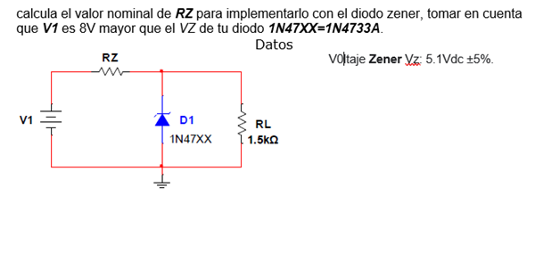 Calcula el valor nominal de RZ para implementarlo con el diodo zener, tomar en cuenta que V1 es 8V mayor que el VZ de tu diodo 1N47XX=1N4733A