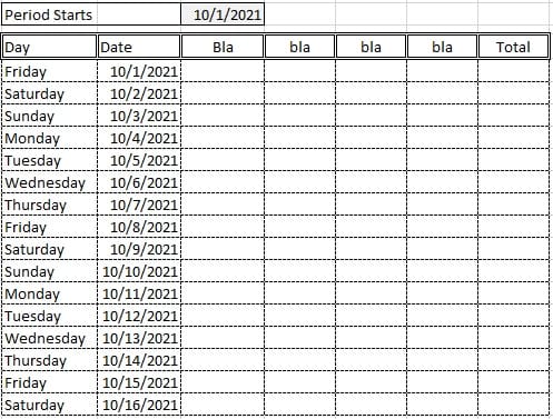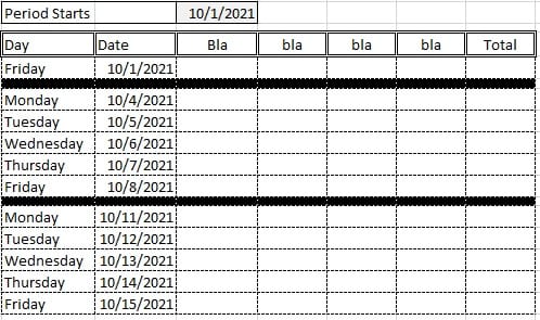 Después de que la macro haya hecho su trabajo con las filas, la apariencia de la plantilla quedara como la siguiente imagen. (El color negro en la fila "Sunday" se logra con Formato Condicional y representa el corte de fin de semana)