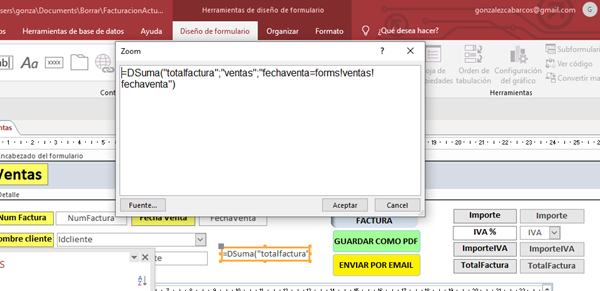 Tengo una tabla llamada r_caja y otra pagos por caja, he creado un cuadro donde en el origen del control he puesto la función dsuma =("importe_pago","pagos por caja","form!pagos por caja=fecha"), el problema es que me dice que faltan argumentos, o algún paréntesis, no sé cuál es el problema he implementado la fórmula según la sintaxis