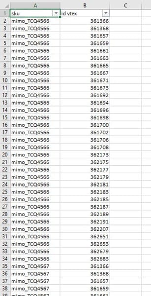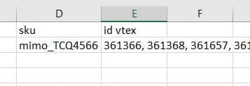 2. Por ejemplo, necesitaría saber cada uno de los ids que posee el producto "mimo_TCQ4566" en una sola tabla de esta manera:
