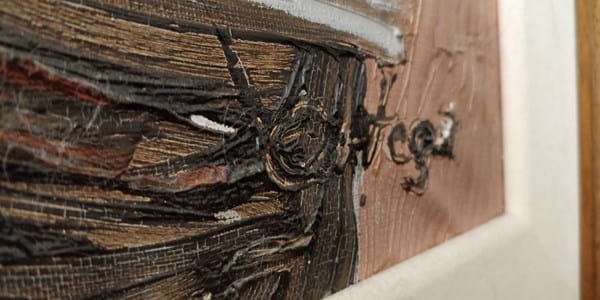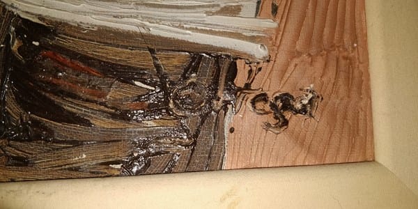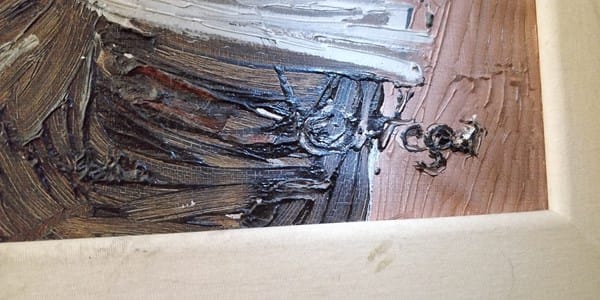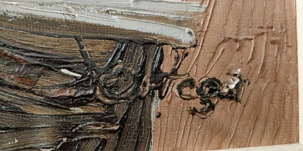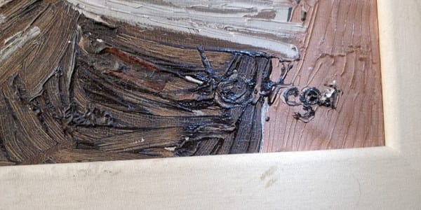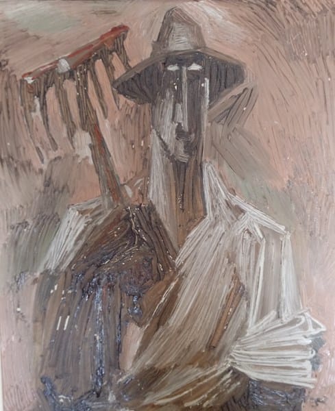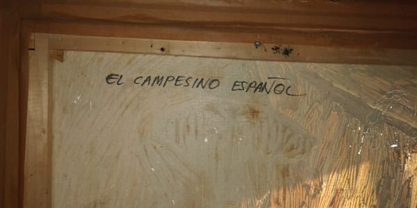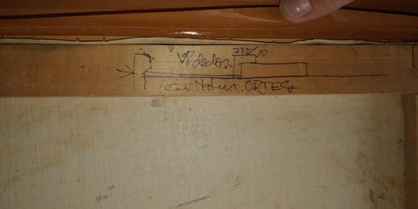 Pintura de Ortega (Desconocido, escuela española). "El campesino español". Óleo sobre lienzo. 73 x 60 cm. Firmado en el ángulo inferior derecha "Orteg". No hemos podido localizarlo en las bases de datos. Inscripción en la parte posterior del bastidor: "Cor Natur Orteg V8 dedos 725/10". Titulado en la parte posterior del lienzo "EL CAMPESINO ESPAÑOL". Bastidor de tipo español delgado con cuñas, tela de algodón, enmarcado. Se observa algo deteriorado con puntos de bolladuras y manchas en el lienzo posterior, pero en general en buen estado.