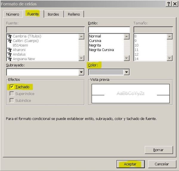 El motivo de la pregunta es poder tachar y colorear de gris un registro de excel dependiendo del valor de una celda que se controla con una celda desplegable.