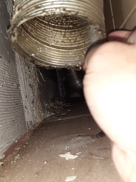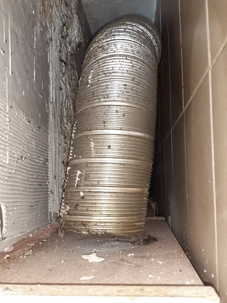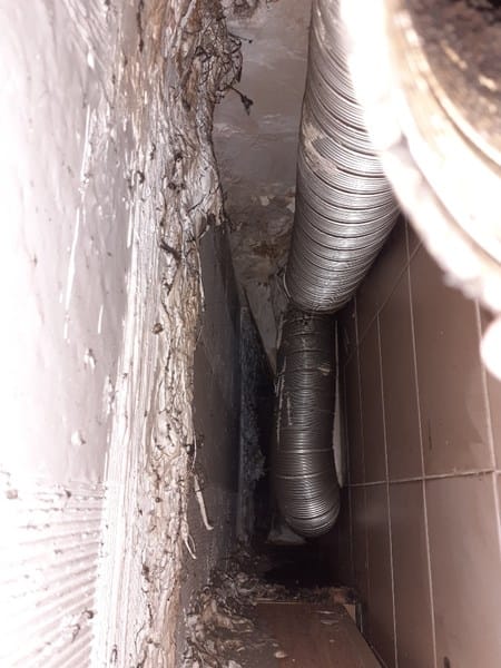 En un piso de segunda mano que acabamos de comprar nos hemos encontrado, tras acceder por un hueco desde el hueco del frigo por la pared de la cocina con un extractor de humos que viene desde el piso de arriba y se encuntra abierto en la terminación que reposa sobre el hueco que formaría la galería que forma el techo y la pared de la cocina por la parte superior. Por las imágenes que adjunto interpreto que vendrían 2 mangas para los gases extractores, una que iría a la izquierda y contectaría con la campana extractora (que está correctamente conectada) y la otra que parte hacia la derecha que termina reposando sobre el hueco con la terminación abierta, como se observa.