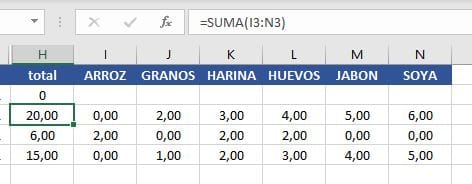 Solicito de su ayuda: tengo un archivo que en cada columna tiene cifras de un rubro en particular. Necesito que en la columna "total" de cada línea inserte la formular SUMA tomando como parámetros a sumar desde la colum i hasta la ultima columna con datos en el cintillo de títulos. Lo que sucede es que puedo ir agregando columnas con el nombre de un rubro, por el el rango de suma es variable. Y no siempre la fila del nuevo registro tiene datos, sino que puede estar en blanco, como se ve la fila 2 en la imagen que adjunto.