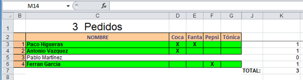 Si "Paco Higueras" pide las 4 cosas necesito que lo cuente como un solo pedido, pero esto lo necesito para unas 500 filas. Lo que he hecho es poner en la columna K la fórmula: =SI(O(D3="X"; E3="X";F3="X";G3="X");1;0) de manera que como se aprecia en la imagen cuenta 1 si cualquiera de las 4 opciones está marcada. En C1 suma la columna K y así obtengo el total de pedidos. El problema es que no es operativo ya que la columna K, que se extiende hasta la fila 500, a la hora de eliminar filas da problemas porque está bloqueada. En fin, necesitaría que este cálculo lo hiciera en una celda, por ejemplo en C1, para las 500 filas. Y que no sea en código vba para que se actualice según se ponen X. Quizá parezca una tontería pero le he estado dando vueltas y no sé como hacerlo.