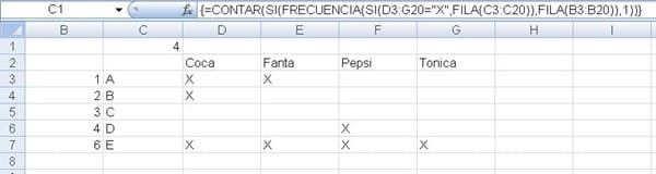 Necesito una función que al marcar con una X una de cuatro posibles celdas, independientemente de si se marca 1, 2, 3 o las 4 opciones, lo cuente como 1, y que sume todas estas opciones.