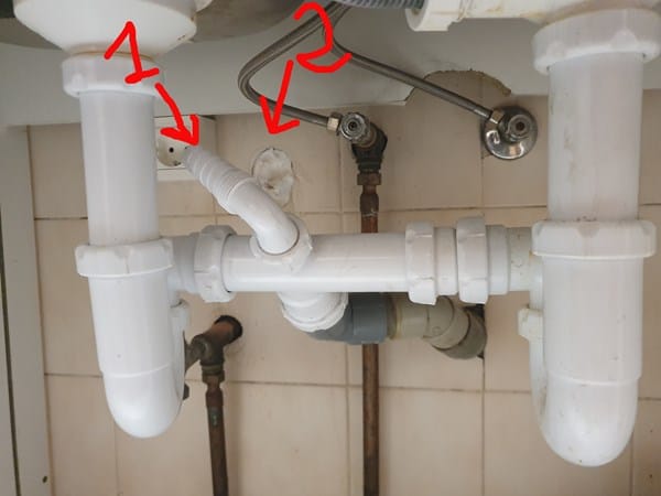 En una vivienda a reformar que hemos adquirido recientemente, nos hemos encontrado con el siguiente panorama debajo de la fregadera que se puede observar en la imagen, donde el número 2 es un desagüe taponado con silicona.