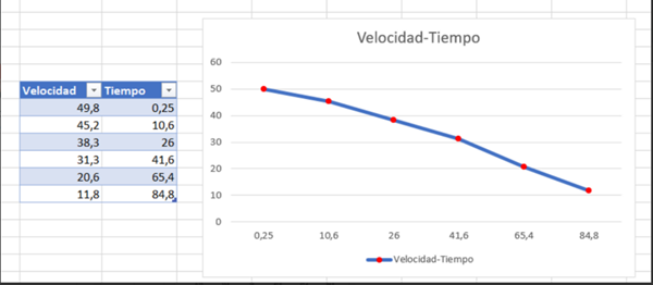 Delta t variando entre 0.25 y 10.6 seg.>>>>>>>Delta v entre 49.8 y 45.2 >>>>Pendiente = Delta v / Delta t = 45.2 - 49.8 / 10.6 - 0.25 = -4.6 / 10.35 = - 0.44 m/s^2 >>>>> Esta pendiente representa aquí la aceleración media dentro del intervalo de tiempo considerado.