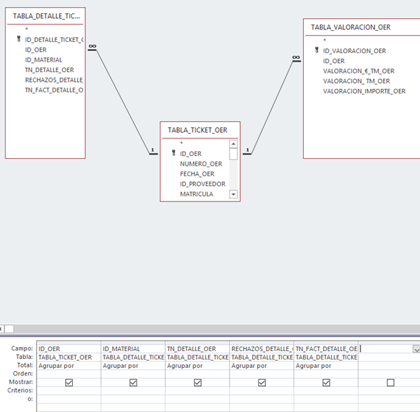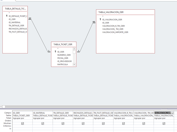 Tengo tres tablas (ticket), (detalle) y (valoración), las tres están unidas por un campo (Id_Oer), al hacer una consulta solo con los datos de ticket y detalle los datos que me devuelve son correctos:
