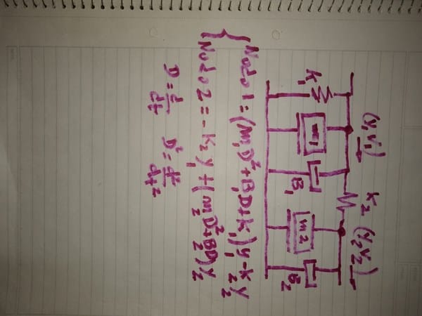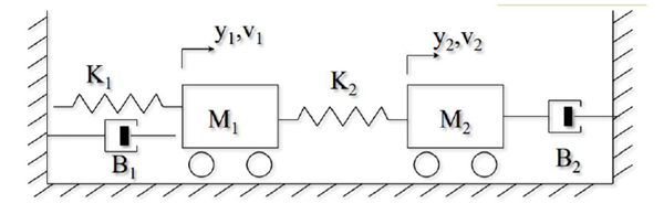 Se tiene un sistema masa – resorte – amortiguador como el de la figura conformado por dos masas ?1 y ?2, dos resortes ?1 y ?