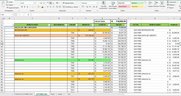 Como se puede observar en esta imagen es la hoja que se llama octubre 2021y es la hoja 2, aquí es donde coloco la fecha, benefiiciario, referencia, cheque, ingreso, egreso y saldo,