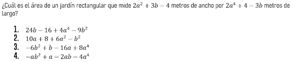 Cual es el área de un jardín rectangular que mide 2a al cuadrado +3b-4 metros de ancho por 2a al cubo -3b